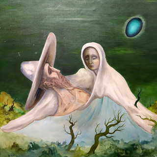 De la pintora Sofía Bassi (1913-1998), se exhibe un óleo, en el que se ve uno de los elementos característicos de su obra surrealista, la integración de la figura de un huevo de color azul brillante, ya que para ella era símbolo de fertilidad y renacimiento.