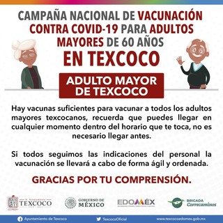 La presidenta municipal de Texcoco Sandra Luz Falcón Venegas, reiteró el llamado a los adultos mayores y a sus familias, que eviten aglomeraciones, no hay necesidades de formarse un día o che antes o durante la madrugada, ya que el horario de vacunación será de 8:00 a 17 horas en completo orden y respetando las medidas de distanciamiento social.